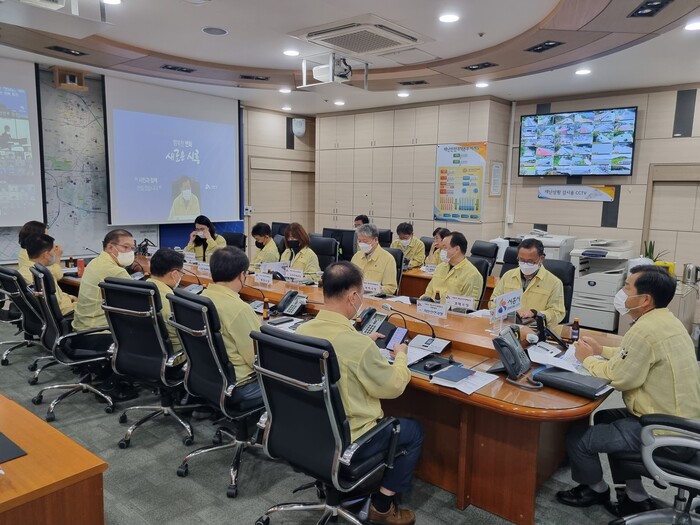 3일 시흥시청 재난안전상황실에서 열린 회의에는 각 국장, 전 부서 과장, 각 동 주민센터 동장이 참석해, 행안부 대책회의를 영상으로 참관했다. 행안부는 태풍 피해가 발생하지 않도록 중점관리사항을 전파하고, 대처계획을 공유했다.