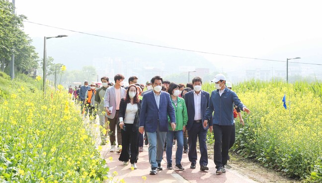 앞서 시는 지난해 11월부터 공공형 일자리 참여자 77명과 새마을회, 부녀회 등 주민들이 힘을 모아 하천 주변에 방치된 쓰레기를 정리하고 경안천 일대 산책로 2.5㎞ 구간에 유채꽃 150㎏를 심어 조성했다.