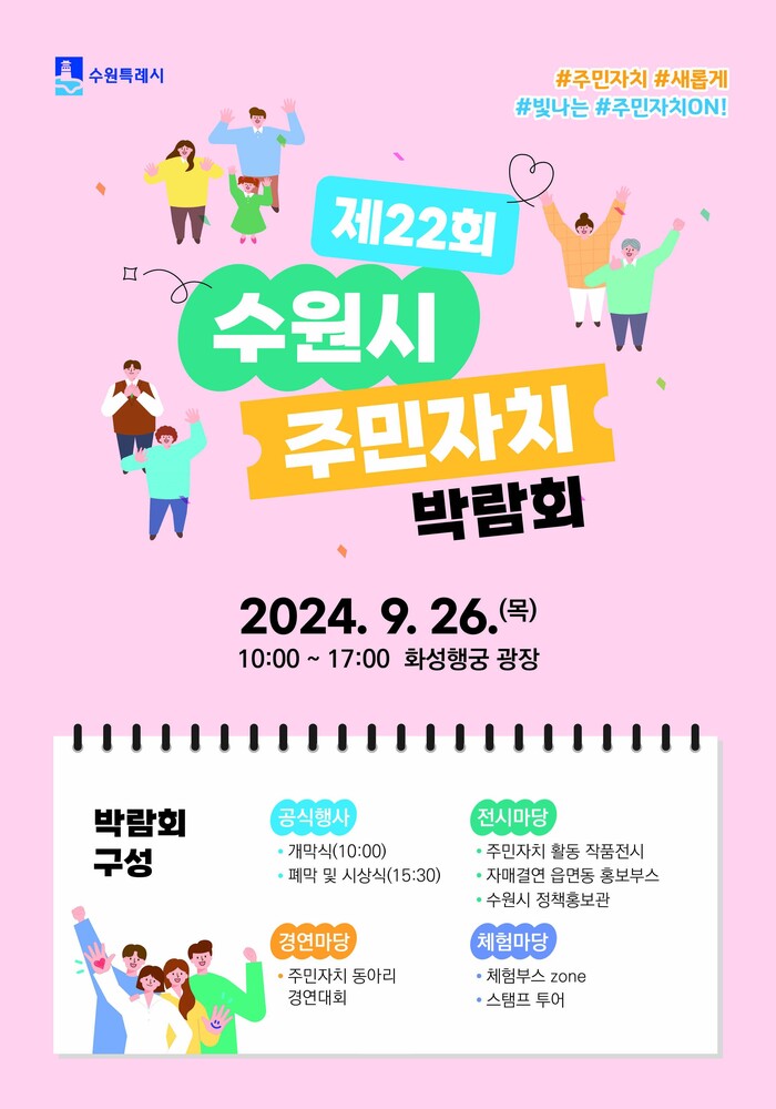 수원시(시장 이재준)가 9월 26일 오전 10시부터 오후 5시까지 화성행궁광장에서 ‘제22회 수원시 주민자치박람회’를 개최한다.