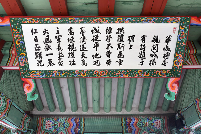 “왕의 시문 현판은 높은 위계의 칠보문(七寶紋)을 작용하는 게 타당하다”는 전문가 의견에 따라 테두리에 칠보문을 그렸다. 시문 현판은 원래 서장대 2층에 걸려 있었지만, 시민들이 편하게 볼 수 있도록 1층에 걸었다.