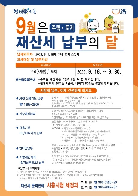 9월 정기분 재산세에 대한 문의사항은 시흥시청 세정과(주택분 031-310-3526~29/토지분 031-310-2082~87)로 문의하면 된다.