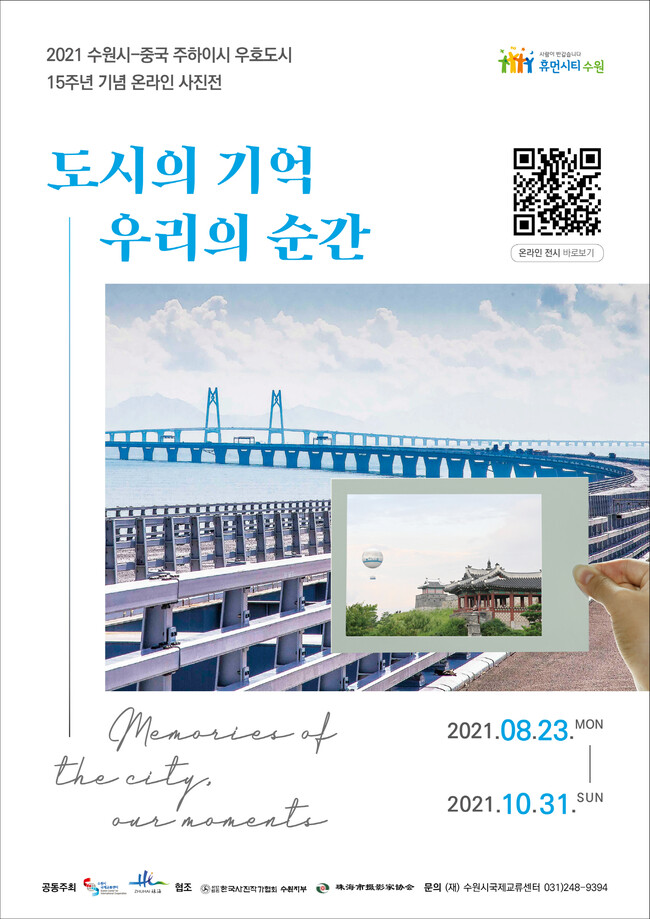 수원시국제교류센터는 오는 23일부터 10월 31일까지 2021년 수원시-중국 주하이시 우호도시 15주년 기념 온라인 사진전 ‘도시의 기억, 우리의 순간’을 개최한다.
