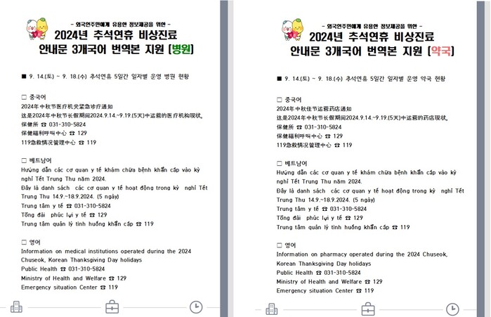 시흥시(시장 임병택)는 추석 연휴 기간 언어소통에 어려움을 겪는 외국인 주민들이 의료서비스를 원활히 이용하고 의약품 구매 불편을 해소하기 위해 보건소에서 제공하는 비상진료 안내 홍보물을 3개 언어(베트남어, 중국어, 영어)로 번역해 지원한다.