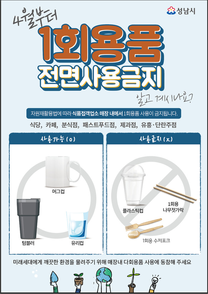 성남시는 오는 4월 1일부터 카페, 식당, 제과점, 패스트푸드점 등 식품접객업소 매장 안에서 1회용품 사용을 전면 금지한다.