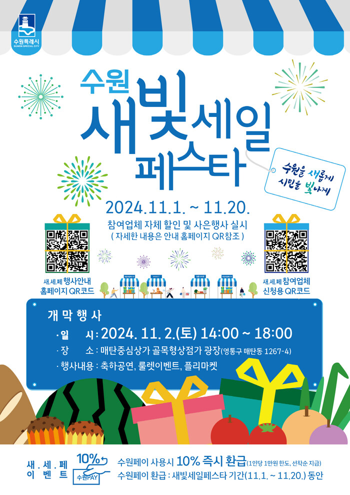수원시 소상공인·전통시장·백화점·대형마트 등이 참여하는 대규모 할인행사 ‘제4회 새빛세일페스타 수원’이 11월 1일부터 20일까지 열린다.