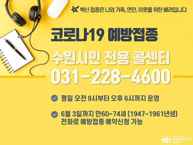 수원시민 전용콜센터(031-228-4600)는 수원시민의 코로나19 예방접종 예약신청을 돕고, 관련 상담을 해준다.