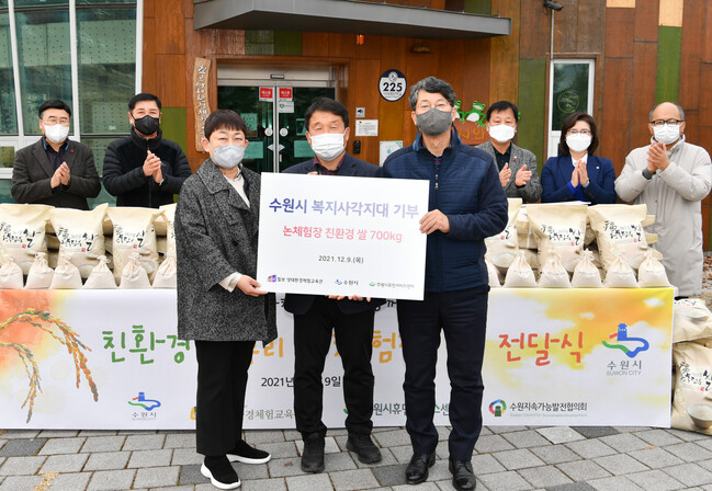 수원시는 9일 칠보 생태환경체험교육관 잔디마당에서 ‘친환경 논 체험장 쌀 전달식’을 열고, 친환경 쌀 1000kg(10kg 100포대)을 수원시휴먼서비스센터(700kg)와 수원시지속가능발전협의회(300kg)에 전달했다. 지속가능발전협의회에는 올해 처음으로 쌀을 기부했다.