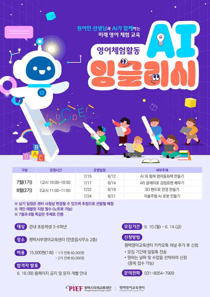 이번 프로그램은 올해 처음으로 원어민 선생님과 함께 AI 기술을 활용해 4차산업 시대 맞춤형 영어 교육 프로그램을 학생들에게 제공하기 위해 마련됐다. 또한, 서부지역 활성화를 위해 안중읍 행정복지센터 2층에 있는 서부영어교육센터 체험 교실에서 진행될 예정이다.
