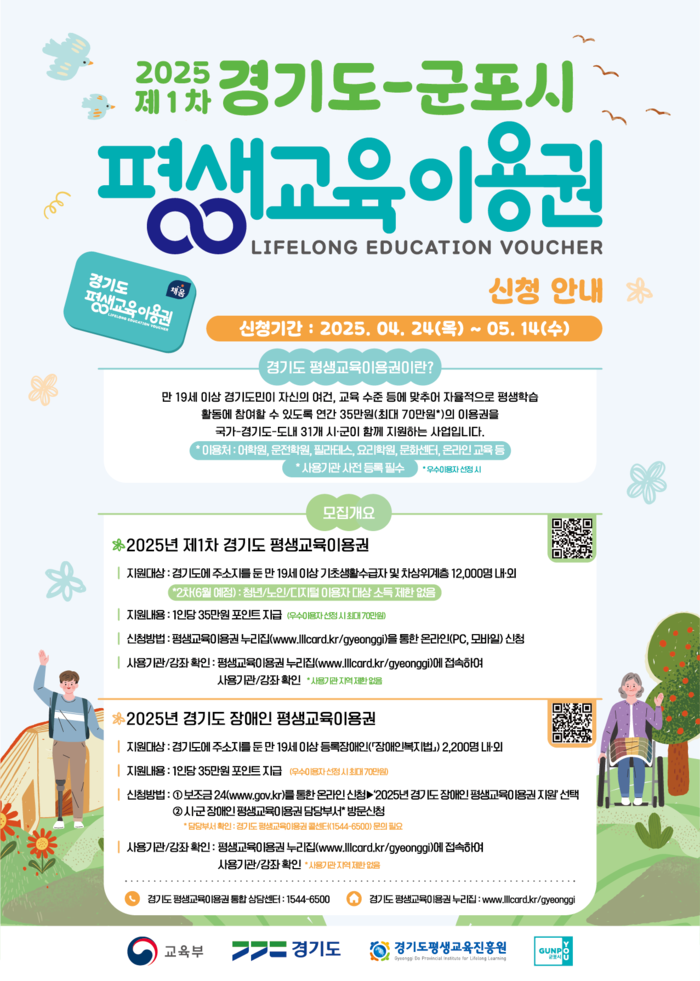 신청기간은 4월 24일 9시부터 5월 14일 18시까지로, 기초생활수급자 및 차상위계층은 경기도 평생교육이용권 누리집(www.lllcard.kr/gyeonggi)에서, 장애인은 정부24(보조금24)에서 신청해야 한다.