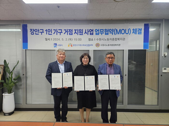 사진/수원시는 장안구지역사회보장협의체 및 수원시노동자종합복지관과 지난 5월 2일 장안구 1인 가구 거점사업 업무협약을 체결했다.(사진제공=수원시)