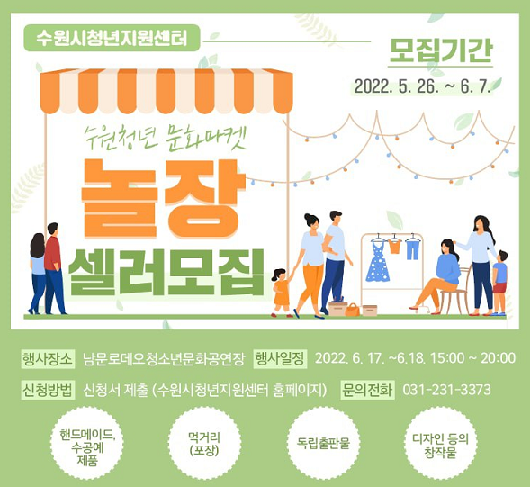 수원도시재단 청년지원센터가 수원청년 문화마켓 ‘놀장’에 참여할 셀러(판매자)를 6월 7일까지 모집한다.