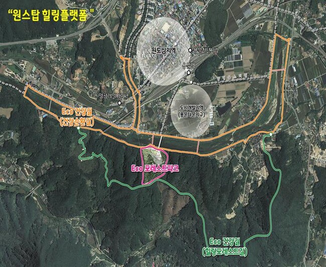 경기 라온에코포레스트 조성사업은 용문면 다문리 산38-1번지에 방치된 폐 철도 자갈 채석장 부지를 활용해 자연·인공형 클라이밍장을 비롯한 다양한 산림레포츠 시설을 도입하고, 기 조성된 경기도 순환둘레길과 연계하는 두가지 코스의 건강길을 조성해 양평군의 관광활성화 뿐만 아니라 지역주민의 복지 향상에 기여할 수 있는 시설로 계획 중이며, 순환길을 통해 용문천년시장과 용문역을 연결해 누구나 쉽게 접근 할 수 있는 ‘원스탑 힐링플랫품’을 구축한다는 계획이다.