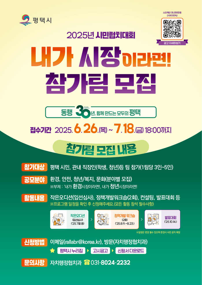 평택시(시장 정장선)는 시민이 직접 정책을 제안하고 함께 시정을 만들어가는 「2025 시민협치대회 ‘내가 시장이라면!’」 참가팀을 오는 7월 18일까지 모집한다.