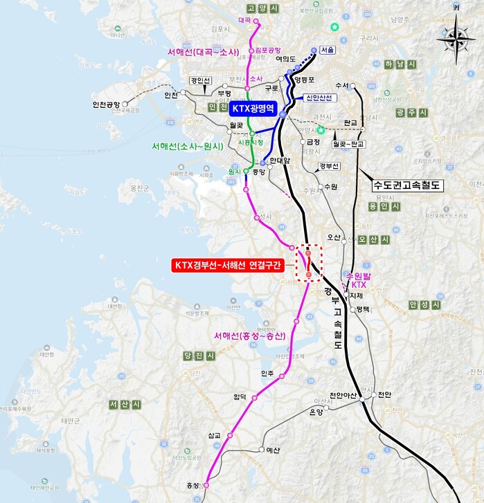 KTX경부선-서해선 연계사업은 두 노선 간 연결선 7.35km(화성 향남~평택 청북)를 신설해 충남 홍성에서 경기도(KTX광명역), 서울까지 연계하는 사업이다.