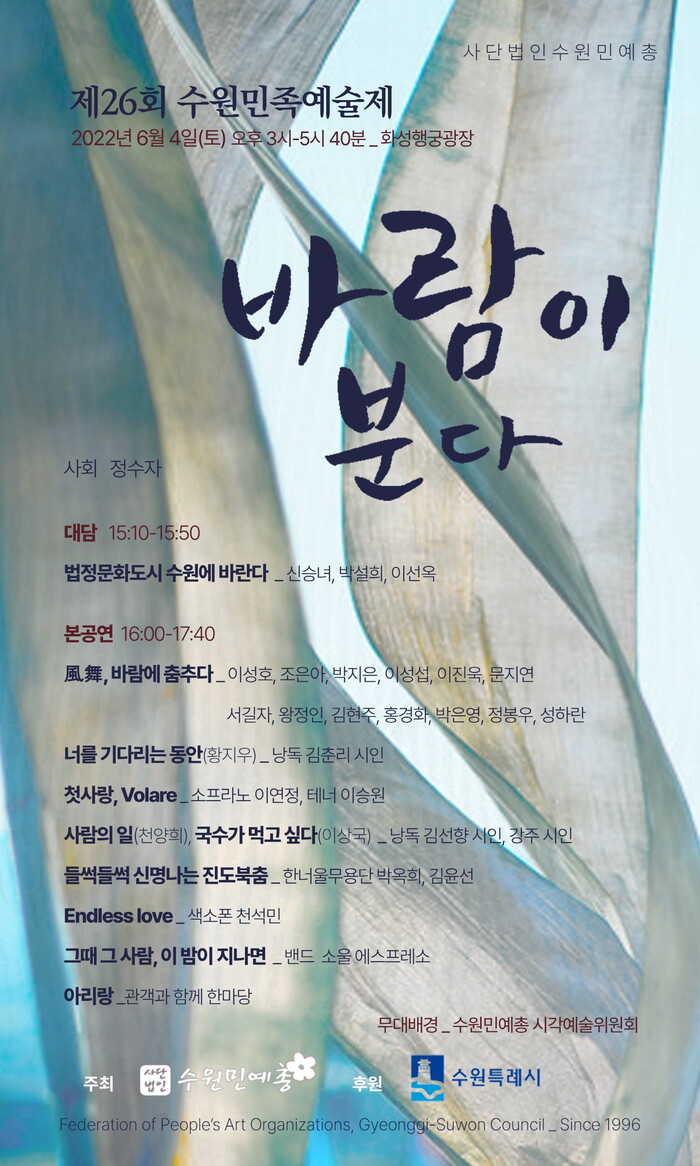 올해는 ‘바람이 분다’를 주제로 코로나19 장기화로 지친 시민들의 마음에 즐거운 바람(風)을 일으키고, 새롭고 활기찬 기운이 샘솟길 바라는 수원민예총 예술인들의 바람(소망)을 담은 다채로운 문화공연이 펼쳐진다.