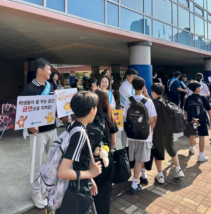수원시 권선구보건소가 9일 능실초등학교 정문에서 청소년 흡연·범죄 예방 캠페인을 펼쳤다.