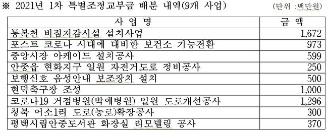 사진설명/ 2021년 1차 특별조정교부금 배분 내역(9개 사업)