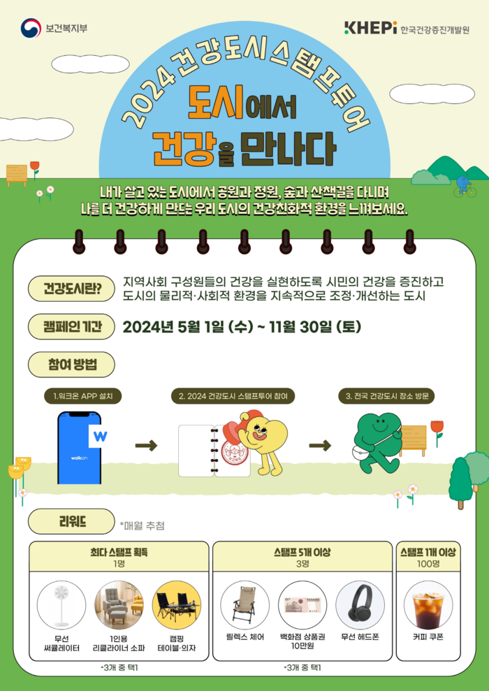 ‘워크온’ 앱을 내려받아 2024 건강도시 스탬프투어 ‘도시에서 건강을 만나다’를 눌러 참여할 수 있다. 전국 220개 건강도시 장소 중 원하는 곳을 방문해 스탬프를 받으면 된다.