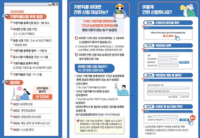 직불금 신청은 비대면과 대면 신청으로 나눠 진행된다. 비대면은 2월 1일부터 2월 28일까지 온라인 간편 신청으로, 대면은 3월 4일부터 4월 30일까지 농지소재지 동 행정복지센터를 방문해 신청할 수 있다.