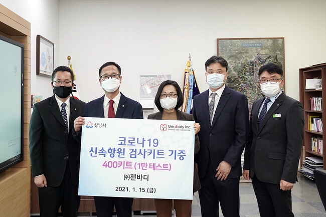 성남시는 이날 오후 3시 시장 집무실에서 은수미 성남시장, 김진수 ㈜젠바디 대표 등이 참석한 가운데 ‘코로나19 신속 항원 검사키트 1만 회분 기증식’을 했다.