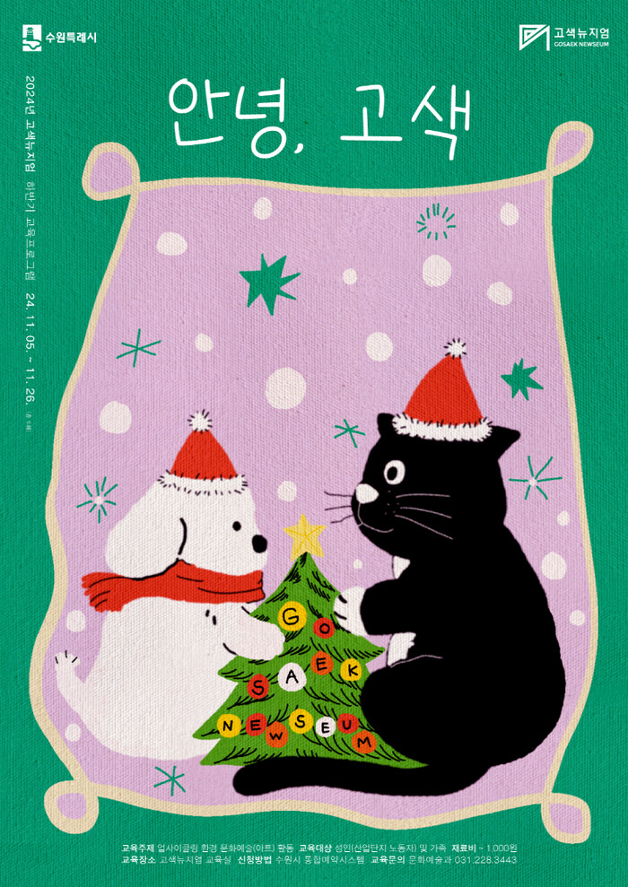 수원특례시 통합예약시스템(http://www.suwon.go.kr/web/reserv/index.do)에서 ‘고색뉴지엄’ 또는 ‘안녕, 고색’을 검색 후 신청할 수 있다. 11월 1일 오후 2시부터 선착순으로 모집한다. 교육 회차별로 교육 시간과 재료비(최대 1000원)를 확인해야 한다.