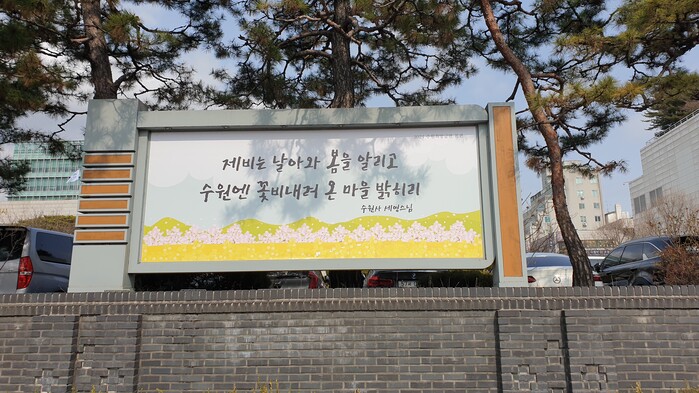 수원시가 2024년 수원희망글판 봄편 문안 ‘제비는 날아와 봄을 알리고 수원엔 꽃비 내려 온 마을 밝히리’를 5월까지 수원시 곳곳과 수원시 유튜브 채널에 게시한다. 수원사 회주 세영스님의 메시지다.