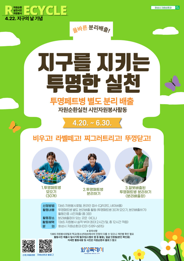 화성특례시(시장 정명근)는 4월 22일 ‘지구의 날’을 기념해 투명 페트병 별도 분리배출 자원봉사단을 오는 20일부터 6월 30일까지 운영한다.이번 활동은 일상에서 누구나 쉽게 실천할 수 있는 올바른 쓰레기 분리배출을 통해 자원순환 문화를 확산하고 시민 주도의 환경보호 활동을 장려하기 위해 추진됐다.자원봉사 참여는 가정이나 생활공간에서 무색 투명 페트병(음료·생수병) 30개를 모은 후 분리배출장에서 직접 분리 배출하고 이를 인증하는 방식으로 진행된다.