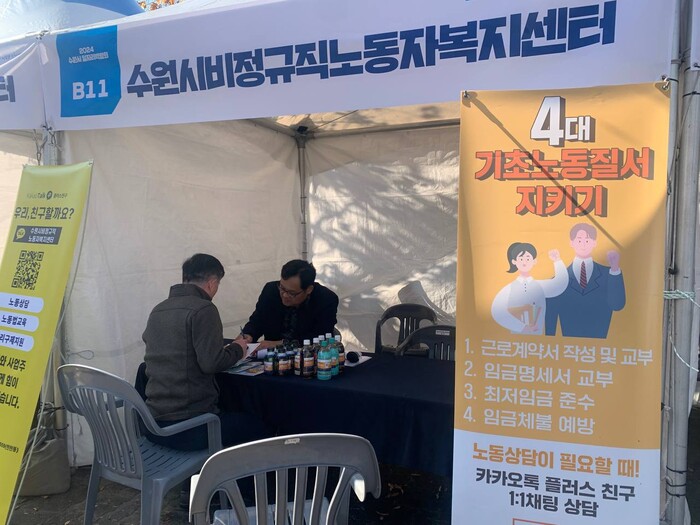 수원시비정규직노동자복지센터가 10월 31일 ‘2024 수원시 일자리박람회’가 열린 수원 올림픽공원에서 4대 기초노동질서 지키기 캠페인을 펼쳤다.