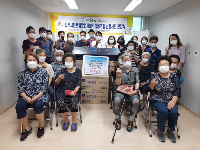 오산시민햇빛발전 사회적협동조합이 오산 대원동에 지역 어르신들의 풍성한 추석을 바라며 생필품 선물 세트 60박스(400만원 상당)를 25일에 기탁했다.