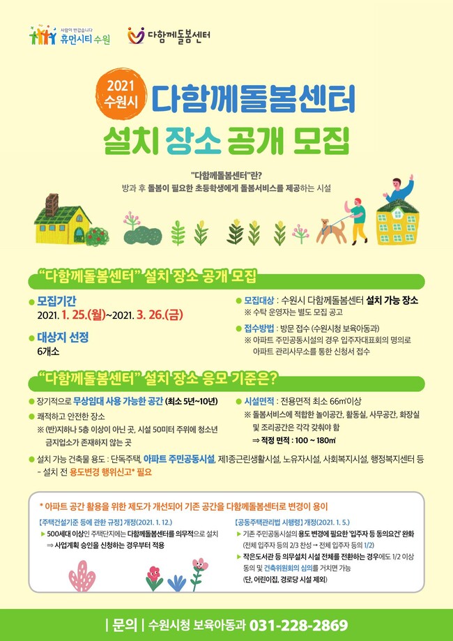 [로컬라이프] 수원시가 25일부터 3월 26일까지 ‘수원시다함께돌봄센터’ 설치 장소를 공개 모집한다.