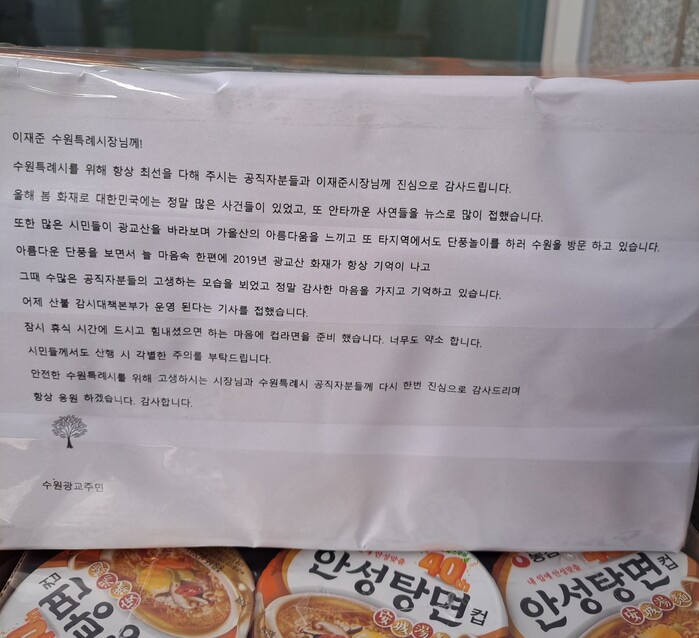 이어 “어제 산불 감시대책본부가 운영된다는 기사를 접했다”며“잠시 휴식 시간에 드시고 힘내셨으면 하는 마음에 컵라면을 준비했다”고 덧붙였다.
