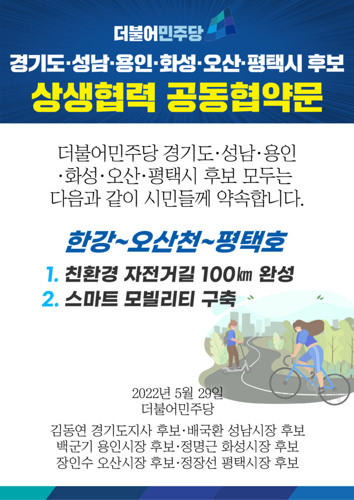 더불어민주당 백군기 용인특례시장 후보는 김동연 경기도지사 후보를 비롯해 성남··화성·오산·평택시장 후보와 함께 한강~오산천~평택호 친환경 자전거길 상생협력 공동협약문을 발표했다고 밝혔다.