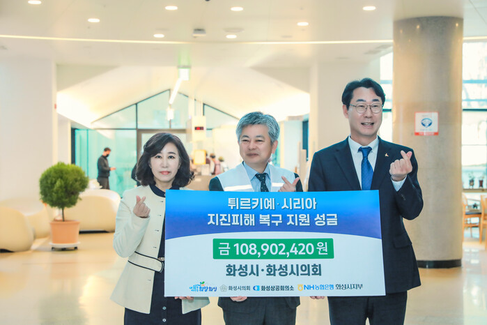 화성시의회는 28일 화성시의회와 화성시, 화성상공회의소, NH농협은행 화성시지부, 화성시민 등이 튀르키예·시리아 지진피해 복구를 위해 모금한 1억 890만원 성금을 대한적십자회에 전달했다.