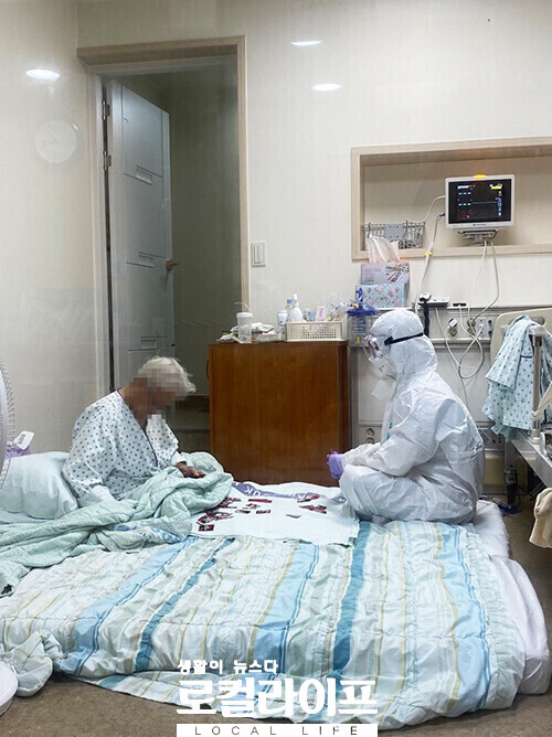 이 사진은 음압병동에 홀로 격리된 90대 치매 코로나 확진 할머니를 위해 방호복을 입은 채 화투로 그림 맞추기 하는 삼육서울병원 간호사들의 따듯한 사랑이 담긴 모습이다.