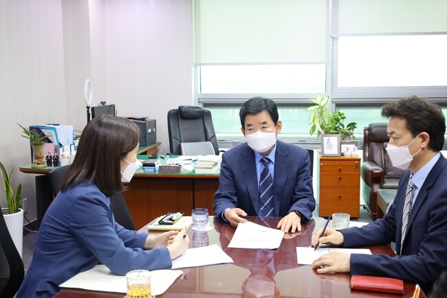 김종천 과천시장은 17일 14시, 여의도 국회의원회관에서 김진표 더불어민주당 부동산특별위원회 위원장을 만나 청사일대 주택공급 문제해결을 위해 힘을 모아달라고 설득했다. 이날 김종천 시장과 김진표 위원장의 만남은 이소영 의원의 주선으로 이루어졌다.