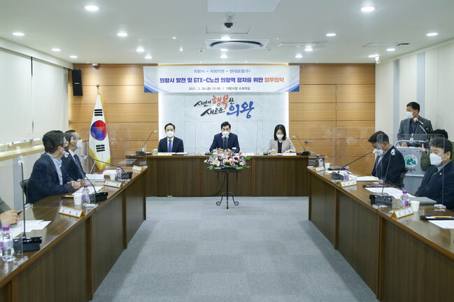 의왕시는 26일 시청 소회의실에서 수도권광역급행철도(GTX)-C노선 의왕역 정차 지원을 위해 김상돈 의왕시장과 이소영 국회의원, 이용배 현대로템 사장 3자 간 업무협약을 체결했다.