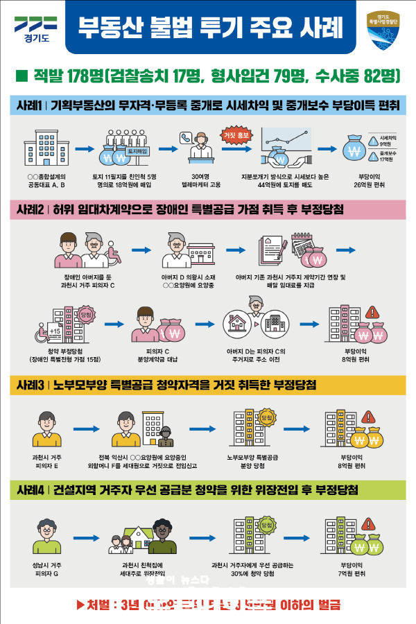 [경기=로컬라이프] 임현상 기자 = 경기도 공정특별사법경찰단이 지난 3월부터 5월까지 실시한 기획수사를 통해 178명의 불법 부동산 투기자를 적발했다. 이들이 얻은 불로소득은 1434억 원에 달하는 것으로 확인됐다.