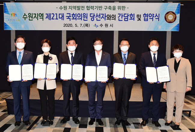 염태영 수원시장과 제21대 총선 국회의원 당선자 5명은 5월 7일, 라마다 프라자 수원 호텔에서 간담회를 열고, ‘수원 지역발전 협력기반 구축을 위한 공동협약’을 체결했다.