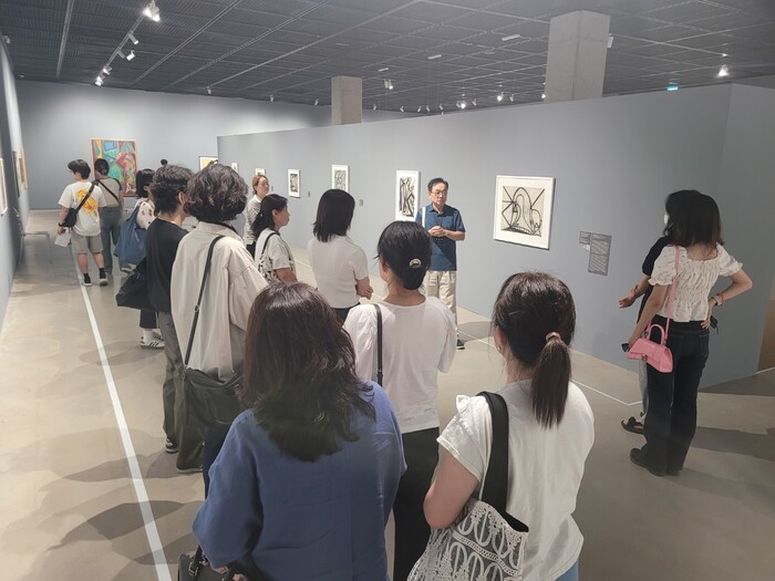 사진/휴먼콜센터 상담사들이 수원시립미술관에서 전시해설을 듣고 있다.(사진제공=수원시)