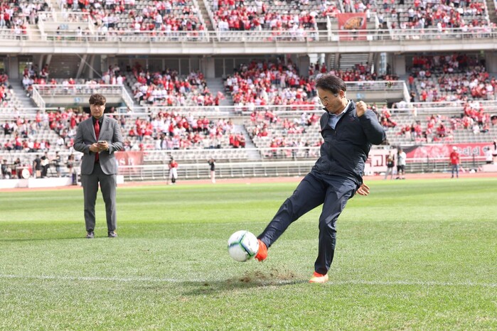 이 시장은 고려대학교와 연세대학교 학생⋅동문들에게 승리를 위한 응원 메시지를 전하고 시축으로 경기의 시작을 알렸다.