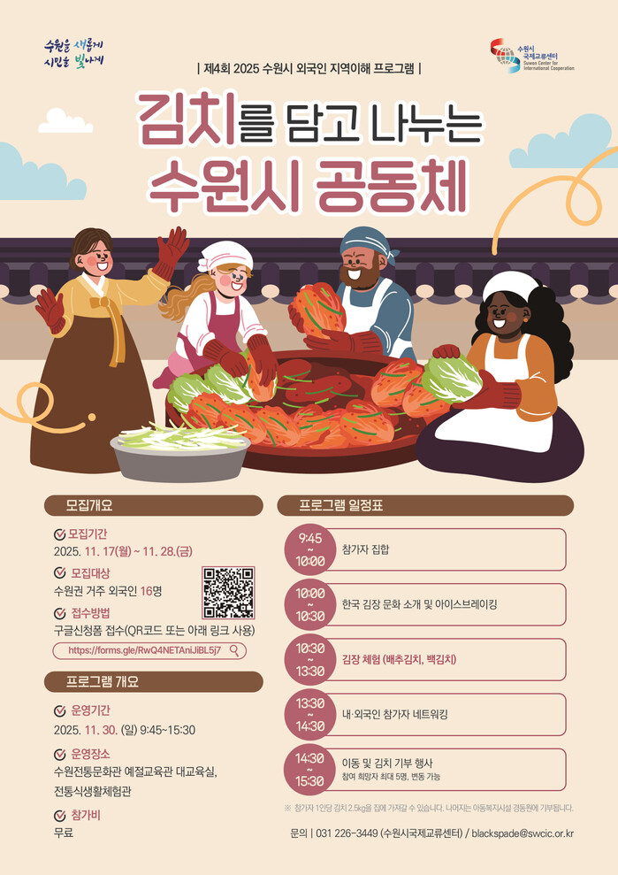 11월 30일 수원시 전통문화관에서 열리는 이번 프로그램에서는 수원시 대학생 공공외교단이 한국의 김장 문화를 소개하고, 외국인 주민과 함께 김치를 담근다. 이날 만든 김장은 사회복지법인 경동원에 전달될 계획이다.