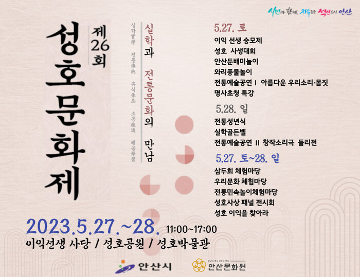 안산시가 주최하고, 안산문화원(원장 이한진)이 주관하는 성호문화제는 올해로 26회째를 맞이했으며, 실학사상과 전통문화를 직접 체험할 수 있는 시의 대표 문화예술제로 자리매김하고 있다는 평가다.