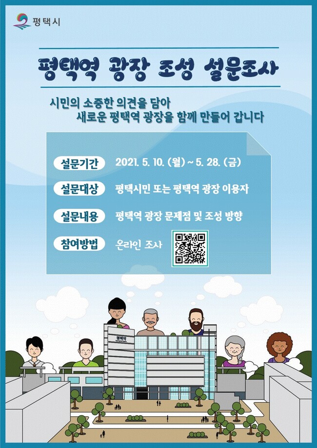 시민공론화 추진계획을 살펴보면, 5월에는 다양한 시민들의 목소리를 듣기 위해 설문조사와 열린토론회를 개최한다. 먼저 설문조사는 5.10.(월)~5.28.(금) 3주간 실시될 예정으로 현재 광장의 문제점 및 조성방향에 대해 홈페이지 온라인 조사와 설문지 배포, 평택역 광장 현장조사(5.21.~22.)를 병행할 계획이다.
