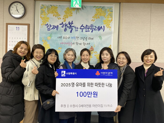 수원시0세아전용어린이집 연합회가 수원시에 ‘취약계층 아동 지원을 위한 후원금’ 100만 원을 전달했다.