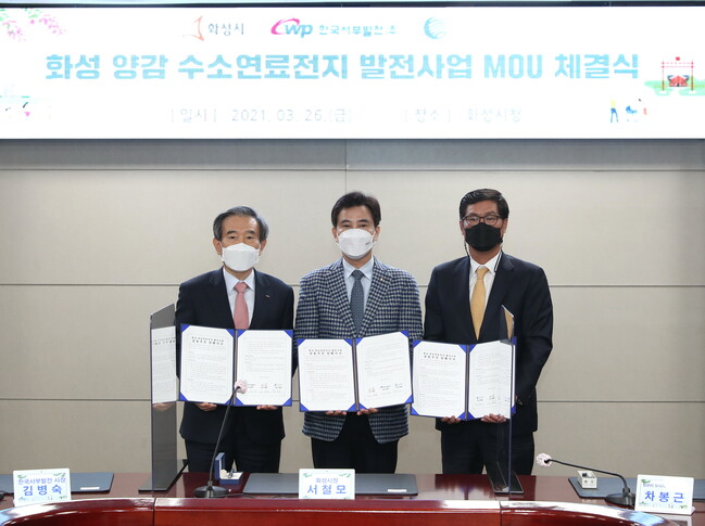 화성시는 26일 이 같은 내용으로 시청 상황실에서 한국서부발전(주), ㈜삼천리와 수소연료발전사업 업무협약을 체결했다.