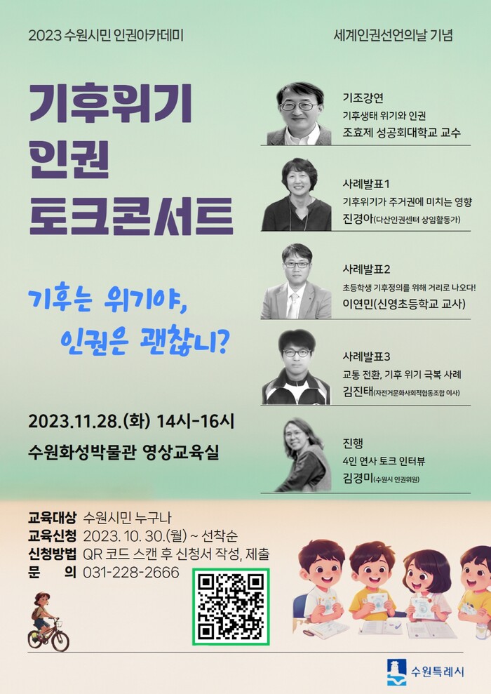 수원시가 기후 위기에 대응 방안을 모색하는 인권 토크콘서트 ‘기후위기×인권 토크콘서트’에 참가자 100명을 선착순으로 모집한다.