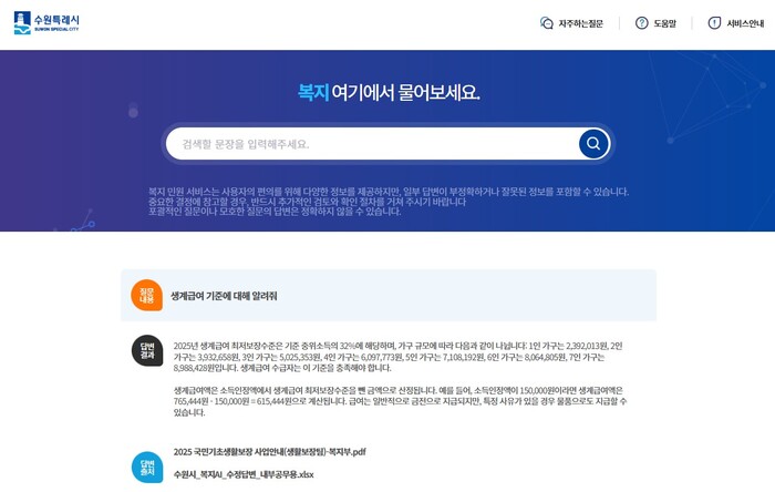 사진/ ‘수원시 AI 복지 민원 서비스’ 홈페이지에 ‘생계급여 기준에 대해 알려줘’를 검색한 결과 화면.(수원시 제공)