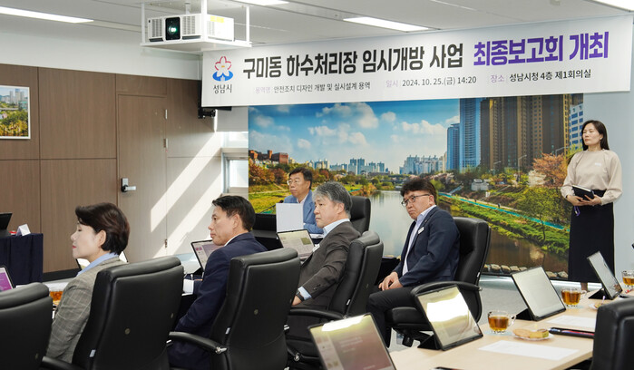 신상진 성남시장은 25일 오후 14시 20분 성남시청 제1회의실에서 개최한 ‘구미동 하수처리장 임시개방사업 안전조치 디자인 개발 및 실시설계 용역 최종보고회’에 참석했다.