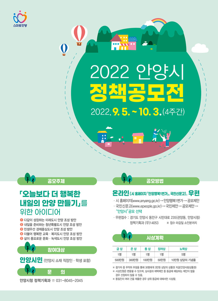 공모 주제는‘오늘보다 더 행복한 내일의 안양 만들기’로 ▲다같이 성장하는 미래도시 ▲내일을 준비하는 청년특별도시 ▲민생우선 경제중심도시 ▲더불어 행복한 교육·복지도시 ▲삶이 풍요로운 문화·녹색도시 등 총 5개 분야이다.