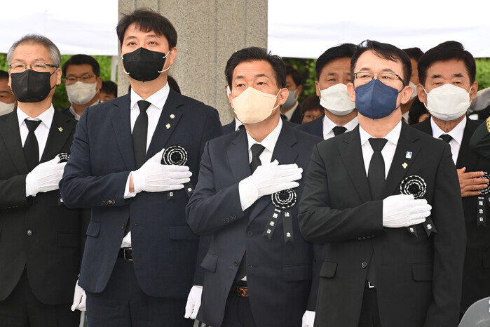 사진/조청식 수원시장 권한대행(오른쪽부터),이재준 수원시장 당선인,조석환 수원시의회 의장 등이 현충일 추념식에 참석하고 있다.(사진제공=수원시)
